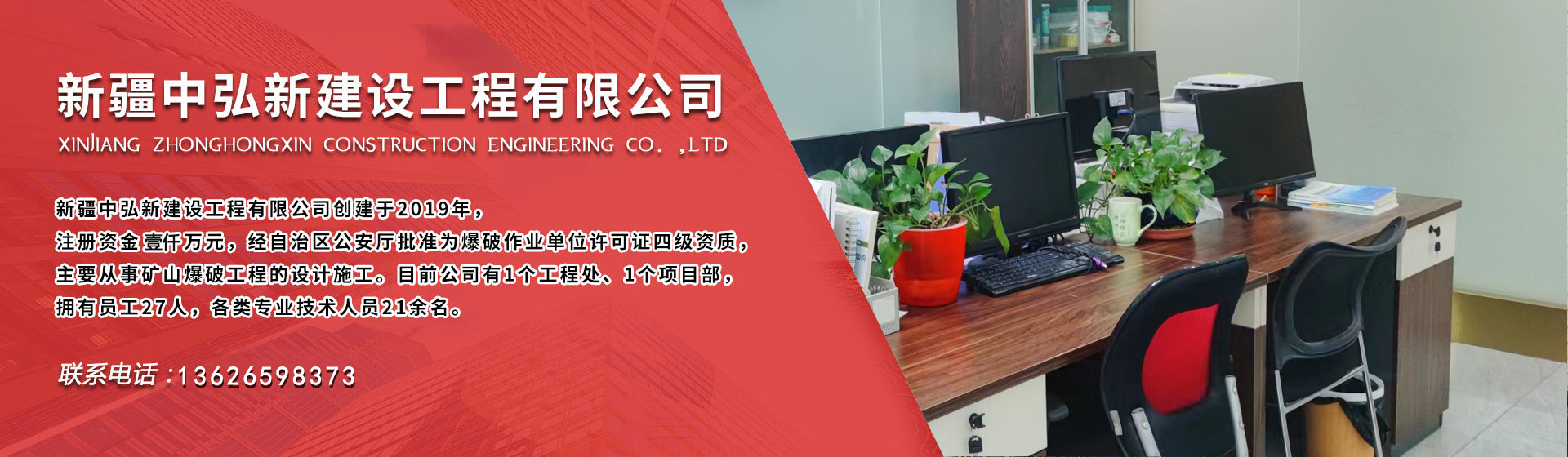 ZHONGHONGXIN CONSTRUCTION ENGINEERING 公 司 簡 介新疆中弘新建設工程有限公司創(chuàng)建于2019年,注冊資金壹仟萬元,經(jīng)自治區(qū)公安廳批準為爆破作業(yè)單位許可證四級資質,主要從事礦山爆破工程的設計施工、礦上采掘施工業(yè)務。目前公司有1個工程處、2個項目部,分...